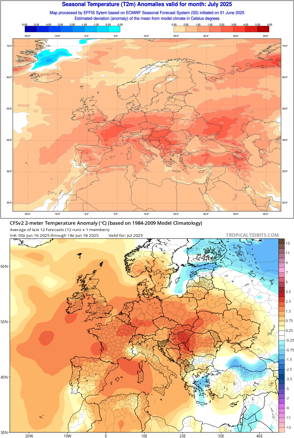Ci-dessus, nous avons mis deux modèles saisonniers majeurs : ECMWF (en haut), CFS (en bas). Les deux cartes ont une sémiologie différente mais elles représentent la même chose : l'anomalie de températures sur le mois de juillet. Que pouvons-nous remarquer ? Elles sont assez semblables. Quelques différences sont présentes mais elles ne concernent pas notre pays. Dans les deux modélisations, la France est plusieurs degrés au-dessus des moyennes de saison.