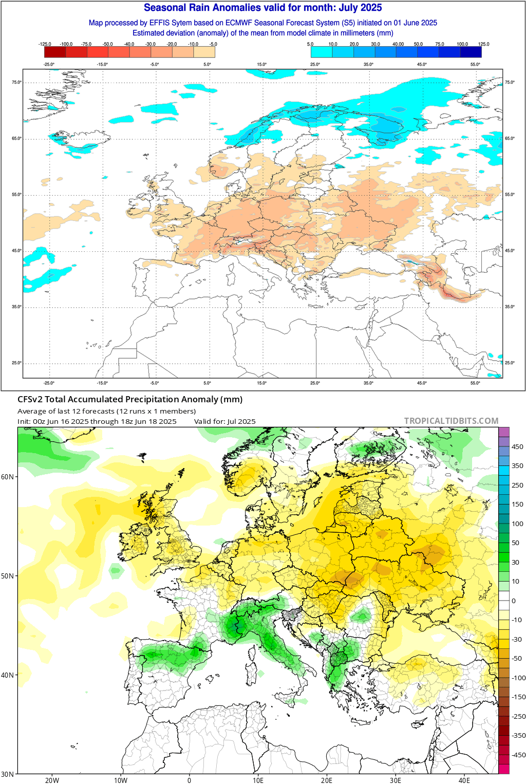 Nous avons également comparé ces deux mêmes modèles sur leurs tendances pour les précipitations sur ce mois de juillet. On peut remarquer quelques différences au premier abord mais les conclusions sont bien plus proches. En effet, le modèle ECMWF (en haut) est globalement vers le rouge/orangé, ce qui signifie qu'il entrevoie un temps sec. Toutefois, si on regarde bien autour de la Méditerranée, nous sommes en blanc et donc dans les moyennes de saison. Le modèle CFS modélise quelques taches vertes (plus pluvieux que la normale). Ces anomalies se concentrent sur les Alpes et le Nord de l'Espagne (ceci s'explique par les orages estivaux qui se développent les après-midis sur les reliefs, très classique pour l'été). Sur notre région, nous sommes globalement dans le blanc et donc dans les moyennes.