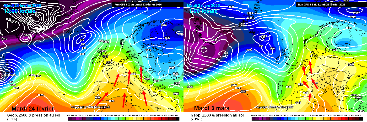 1) Tendance pour la fin février et début mars à l'échelle de la France : d'abord anticyclonique, puis reprise de la circulation dépressionnaire sur l'Atlantique ?