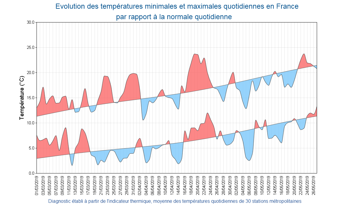 Comme on peut le voir sur la fin de ce graphique, le mois de mai a souvent été frais à l'échelle de la France et notre région ne fut pas en reste. Ces dernières années, avoir un mois plus frais que la normal devient quasiment un exploit. Ce fut le cas en février 2018 avec ces dizaines de centimètres de neige jusqu'en plaine dans notre région. Ces mois frais ou froids sont malheureusement noyés dans de nombreux mois plus chauds. C'est pourquoi, après avoir eu ce printemps relativement frais, la probabilité d'avoir également un été frais est très faible.
