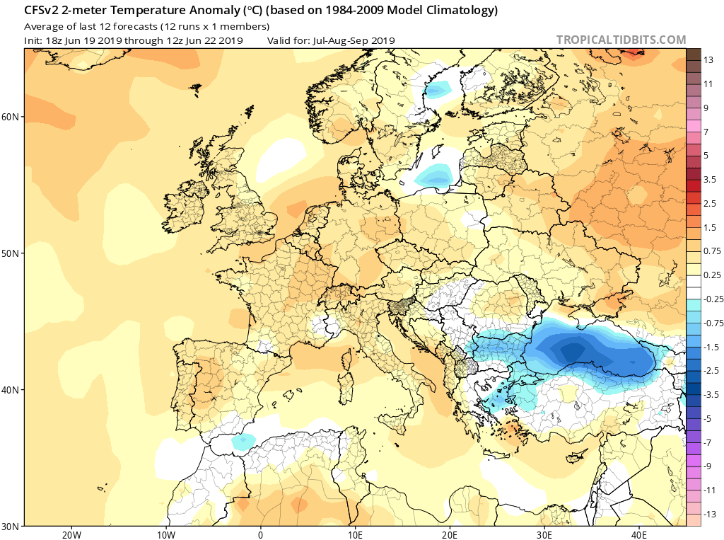 Cette chaleur sera présente à l'échelle de l'Europe. Seuls les secteurs aux abords de la mer Noire pourraient connaitre des températures un peu plus fraîches. Comme dit plus haut, les précipitations seront hétérogènes avec un risque orageux présent ponctuellement, plus probablement près des Alpes et des Pyrénées. En soit, cela reste tout à fait classique. Si l'on doit se réduire au ressenti général, il devrait être assez bon sauf pour les personnes vulnérables lors de périodes très chaudes. A noter que le mois de juillet pourrait un peu plus orageux tandis qu'août serait plus chaud et anticyclonique mais ce dernier point reste d'une fiabilité assez moyenne.