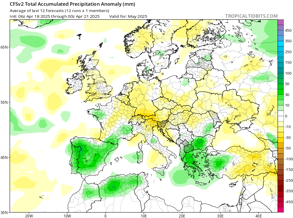 Cette analyse se confirme avec l'anomalie de précipitations ci-dessus. En vert, on remarque une anomalie positive (donc des pluies anormalement élevées) entre l'Espagne et notre région tandis que le temps s'annonce probablement plus sec en allant vers le Nord et l'Allemagne. Il est important de rappeler qu'il s'agit de tendances. Il pourra très bien pleuvoir sur le Nord de la France et nous pourrons très bien avoir de belles journées ensoleillées dans le Sud. Seulement, à l'échelle du mois de mai, il est probable d'avoir des précipitations plus importantes que la moyenne climatique.