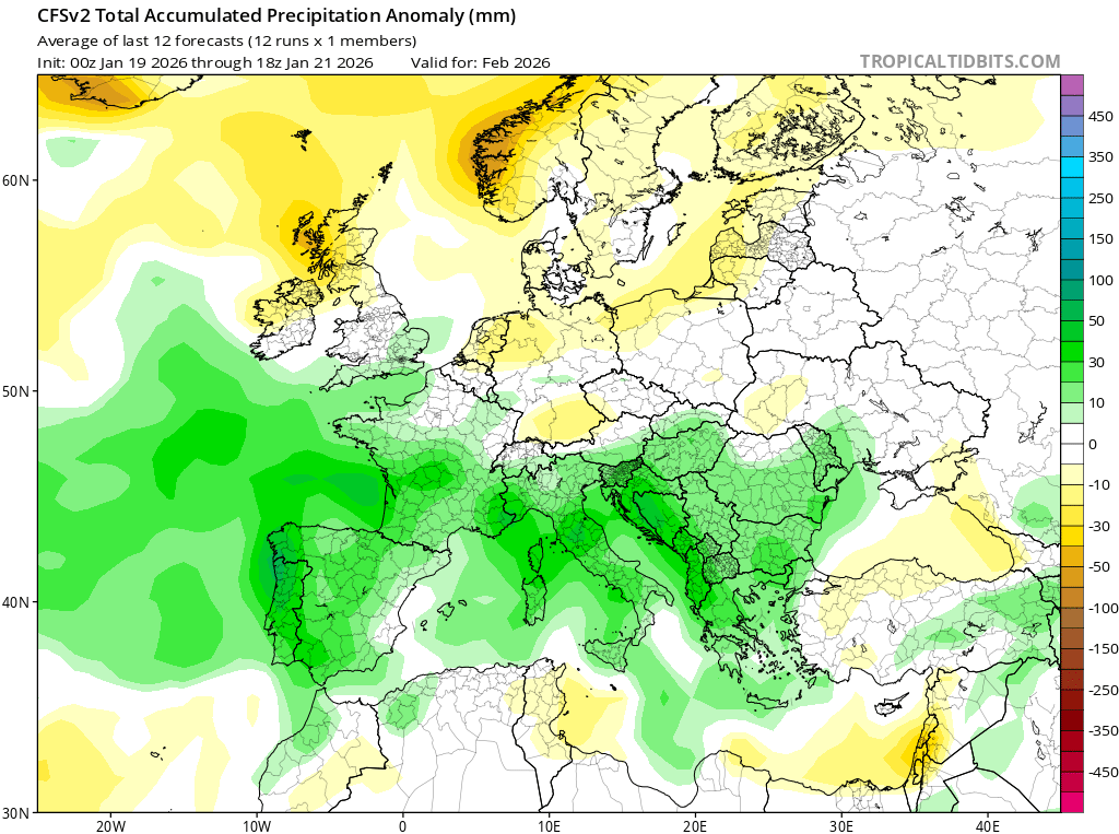 Nous avons remarqué que les modèles saisonniers ont souvent tendance à trop prendre en compte le temps actuel. En effet, si nous avons une longue période chaude et sèche, les modèles auront tendance à prévoir la poursuite de conditions sèches et chaudes. Dans la même idée ici, les tendances se sont progressivement tournées vers un mois de février humide au fur et à mesure que nous enchainions les perturbations. C'est à prendre en considération. En tout cas, la carte ci-dessus démontre bien le signal pluvieux (en vert) sur une large moitié Sud de la France.