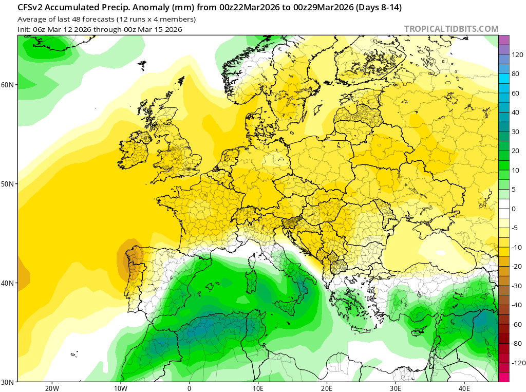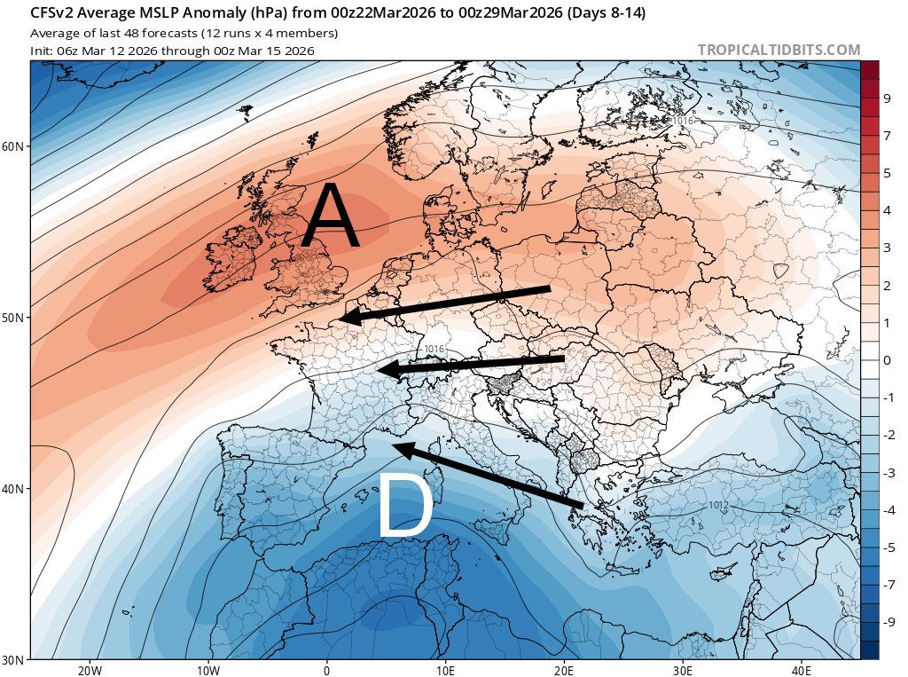Ci-dessus, la carte représente les anomalies de pression modélisées pour la semaine du 22 au 29 mars. On remarque bien l'anomalie positive (hautes pressions) qui ressort sur l'Europe du Nord tandis que le bleu (récurrence de dépressions) est bien présent sur le Sud de l'Europe et notamment en Méditerranée. La fiabilité est globalement bonne dans les grandes lignes. Dans ces conditions, c'est un temps globalement sec qui va se mettre en place sur la France. Le risque de dégradation se limitera au passage d'anomalies par le bias de gouttes froides.