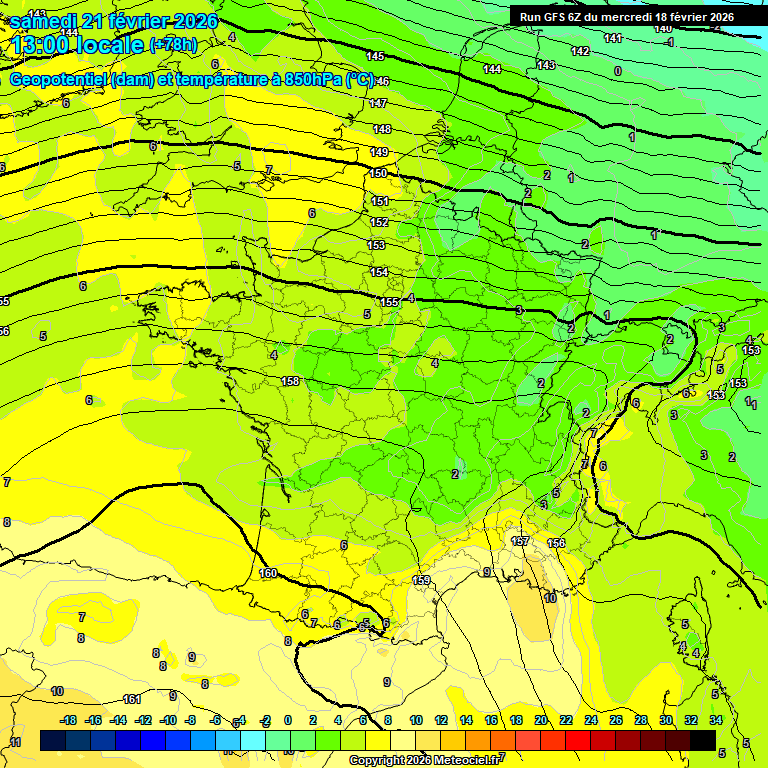 La carte ci-dessous illustre la poussée anticyclonique avec une dorsale provenant de la péninsule ibérique et du Mahgreb qui arrive à atteindre notre région (nous voyons sur nos départements la couleur jaune/orangée, signifiant des températures à 850 m d'altitude à plus de 10°C). Ceci ayant pour effet au thermomètre de prendre quelques couleurs et grimper vers des valeurs autour de 20°C voire potentiellement davantage dans les zones moins exposées au vent.
