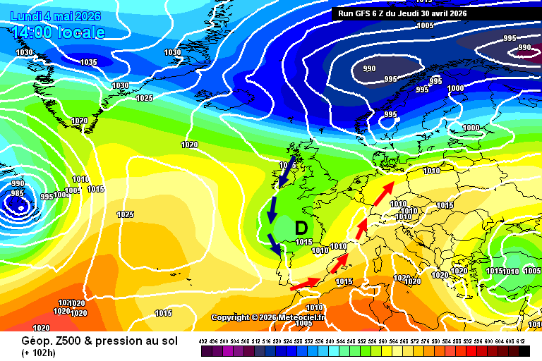 Nous terminons ce mois d'avril 2026 sous l'influence d'un anticyclone qui s'étire de l'Afrique au sud de la Scandinavie en passant par la Méditerranée, la France et l'Allemagne. Deux petites anomalies dépressionnaires circulent sur l'Atlantique : l'une au sud-ouest de l'Irlande et l'autre au nord immédiat des Açores. Elles sont trop loin pour véritablement nous impacter. D'ici samedi 2 mai, le caractère dépressionnaire se renforce progressivement entre l'Irlande et le nord de l'Espagne. Le talweg dépressionnaire sera encore mieux dessiné dimanche, depuis les Îles Britanniques jusqu'au nord de l'Espagne avec un maximum de dynamisme autour du golfe de Gascogne.
