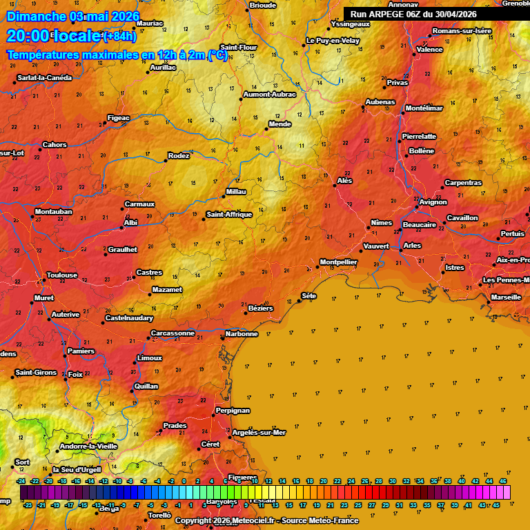 Dimanche : probablement du même ordre. Certes, de belles éclaircies possibles en matinée sur le Roussillon, l'Aude et l'Hérault, mais des nuages élevés déjà épais du Gard à la Lozère. Peu à peu, le voile devient épais partout et on assite à un après-midi nuageux. Maximales autour de 20/22°C en général, sinon jusqu'à 24°C côté Roussillon.