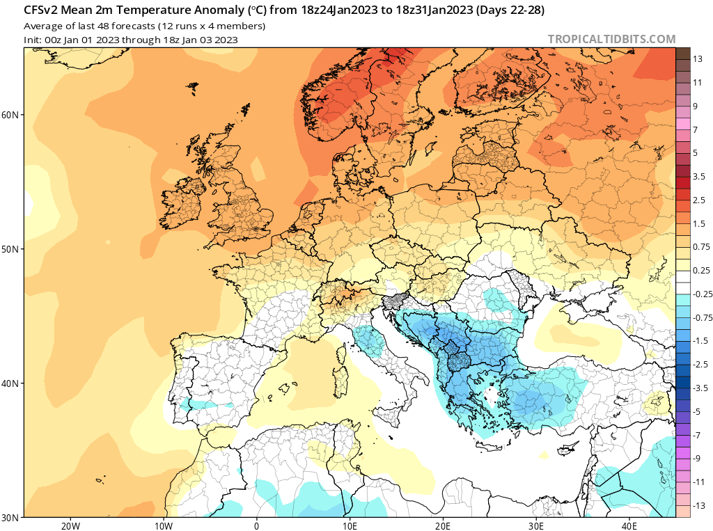 Le mois de janvier pourrait se poursuivre sous la même tendance : alternance d'ondulations dépressionnaires et de percées anticycloniques. Le modèle saisonnier CFS voit des températures dans les normales ou légèrement au-dessus à l'échelle de la France. A noter qu'une vague de froid est attendue sur l'Est de l'Europe. La tendance sera tout de même à surveiller sur la fin du mois bien que la probabilité de débordements vers la France est estimée à moins de 10%.