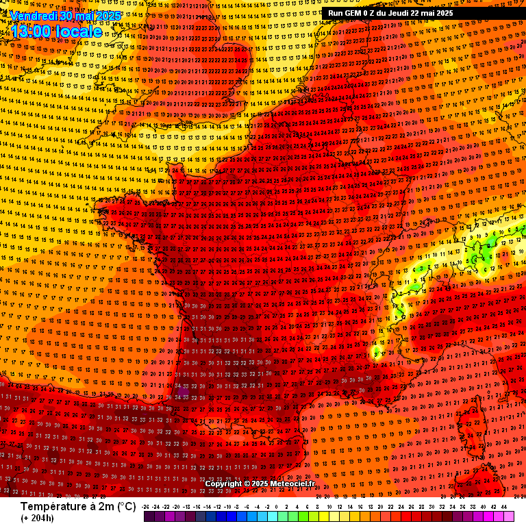 Quant aux températures, nous ne prenons pas grand risque en vous annonçant que les 30°C devraient être atteints sur nos plaines, peut-être même largement dépassés d'ici la fin de semaine prochaine. Certains modèles voient 32 à 33°C. Il est possible, sans que l'on puisse l'affirmer avec exactitude, que l'on soit à la bascule d'un printemps perturbé vers l'été chaud (devenant très chaud) et de plus en plus sec. Tendance évoquée pour la météo du mois de Juin ICI.