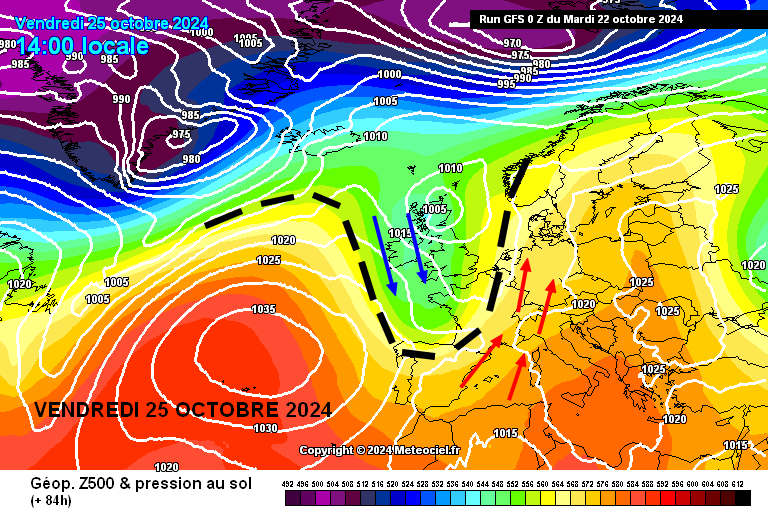La suite est bien plus incertaine car le talweg dépressionnaire va évoluer en cut-off : il s'agit d'une goutte froide dépressionnaire. Cette dernière va entraîner une deuxième dégradation active dans le week-end, sauf qu'il est impossible de dire où car certains modèles voient ce cut-off aller en Espagne, d'autres en pleine Méditerranée... on va donc ci-dessous se focaliser sur le premier passage perturbé, celui du talweg dépressionnaire :