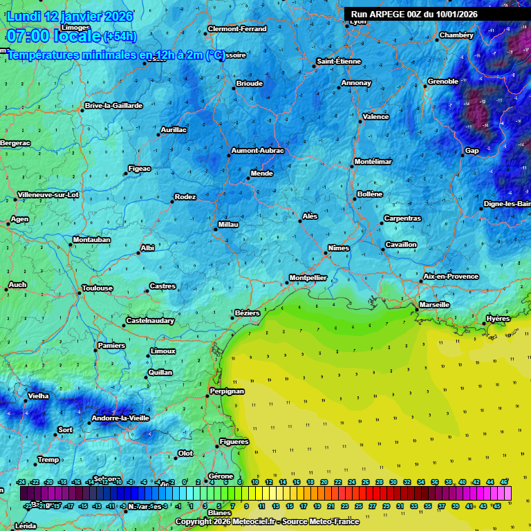 Nous aurons des gelées ce dimanche partout en montagne, parfois fortes, mais aussi sur les plaines du Gard et de l'Est Hérault. Ailleurs, faiblement positif en raison du vent. Avec l'arrêt progressif du vent dimanche soir, de nombreuses gelées sont à prévoir lundi matin jusqu'aux plaines du Languedoc et du Roussillon. Elles seront parfois marquées sur l'Hérault, le Gard et la vallée du Rhône. A partir de la nuit de lundi à mardi, le risque gélif diminue drastiquement se limite aux zones de piémonts Pyrénéens ainsi qu'aux plateaux de Lozère, puis devrait disparaître ensuite. Estimation des minimales pour lundi matin (prévoir 2 à 3°C de moins dans les campagnes) :