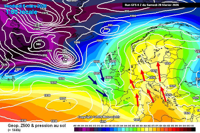 Nous sommes en ce dernier jour de février sous l'influence d'une petite anomalie dépressionnaire circulant sur le nord de la France. Elle implique une petite dégradation. Les hautes pressions anticycloniques se sont décalées sur un axe Algérie / Europe de l'Est. C'est principalement ce mécanisme qui va favoriser l'ouverture du rail dépressionnaire jusqu'à la France la semaine prochaine. On va basculer progressivement vers un nouveau schéma perturbé, dont la durée est très incertaine. Une première anomalie dépressionnaire est attendue entre l'Irlande et le Portugal lundi/mardi. Le dynamisme est modéré, mais ce couloir dépressionnaire reste suffisamment à l'Ouest pour nous laisser à l'écart du "gros de la dégradation".