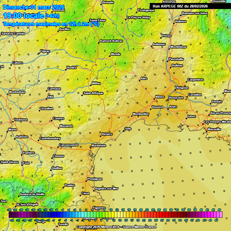 Intéressons-nous pour commencer au week-end qui débute. Ce samedi, ce sont les nuages qui vont largement s'imposer sur nos départements. Quelques pluies sont même probables entre l'Aveyron et la Lozère notamment, plus localement d'ici cet après-midi sur le Gard, le nord Hérault et l'Aude. Il s'agit alors d'averses dispersées. Le ressenti est maussade sous les nuages malgré la douceur. On prévoit 13/15°C sur nos plaines cet après-midi. Demain dimanche, bonne nouvelle ! Si quelques passages nuageux sont encore présents en début de matinée, plus tenaces d'ailleurs sur l'Aubrac et la Margeride, c'est bel et bien le soleil qui va s'imposer pour cette journée.