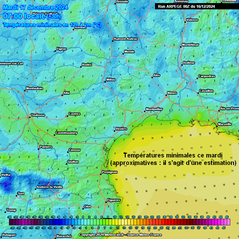 Ce mardi, le soleil résiste très tôt le matin mais cela ne dure pas. Des nuages bas, parfois dédoublés de brouillards, se forment sur les plaines du Languedoc et du Roussillon. Le soleil brille durablement sur les hauteurs : Pyrénées, Cévennes et Lozère. La nuit ayant été dégagée et déventée, de nombreuses gelées blanches sont à prévoir. Les minimales s'approchent souvent des 0°C dans nos campagnes, parfois -2/-3°C dans les secteurs habituellement froids. La plaine du Roussillon est un peu moins froide car les nuages bas s'y installent plus tôt. Les gelées sont parfois fortes sur les sols enneigés de Lozère (jusqu'à -6/-8°C sur les plateaux).
