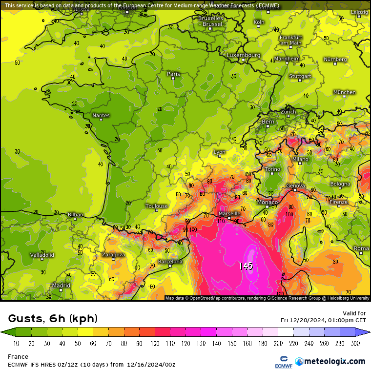 La neige est alors de retour en cours de nuit jusqu'à 1000 m d'altitude environ. Les sommets de l'Aubrac, de la Margeride, du Mont-Lozère et de l'Aigoual vont reblanchir. A noter le retour de la neige aussi en Capcir/Puymorens côté Pyrénées, dans des quantités plus faibles (elles seront à définir). Nous n'excluons pas, pour vendredi en journée, la mise en place d'un fort coup de vent (mistral et tramontane) avec un potentiel significatif de dépasser les 100 km/h. Les températures seront alors en baisse pendant 48/72h. Ci-dessous, carte du vent (modèle CEP, via le site Meteologix).