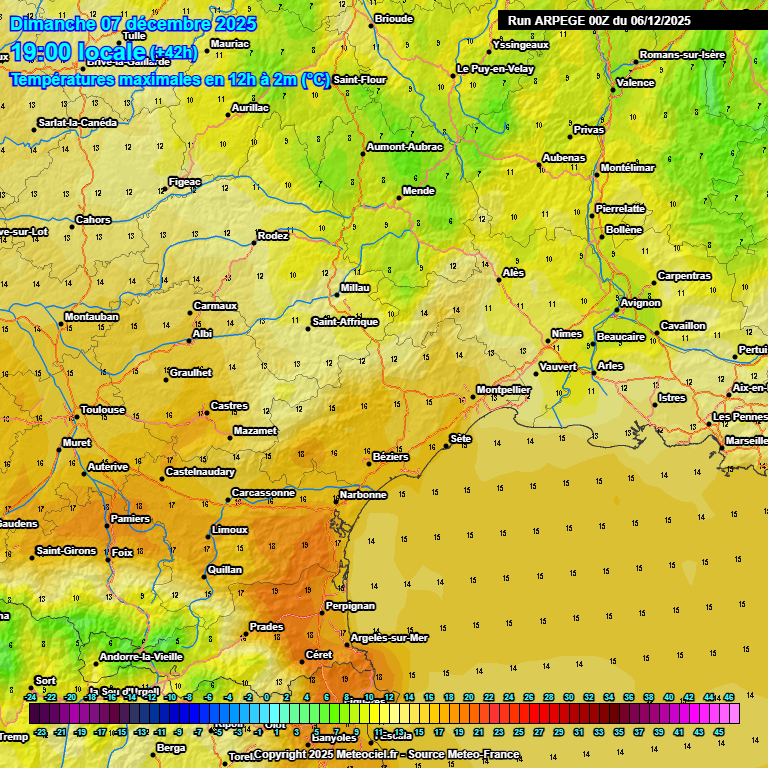 Demain dimanche, les éclaircies gagnent du terrain en général surtout du Roussillon à l'Ouest Languedoc mais le soleil est souvent tamisé par le voile nuageux ailleurs. Pas du plein bleu, donc. Le redoux progresse avec souvent 18/20°C sur le Roussillon et l'Aude en journée, 16/18°C sur l'Hérault et le sud du Gard. Une poche moins douce persiste au nord de Nîmes avec 12/13°C. Il fait facilement 5/6°C à 1500/1700 m d'altitude en Lozère et Aigoual, jusqu'à 13°C dans les vallées.