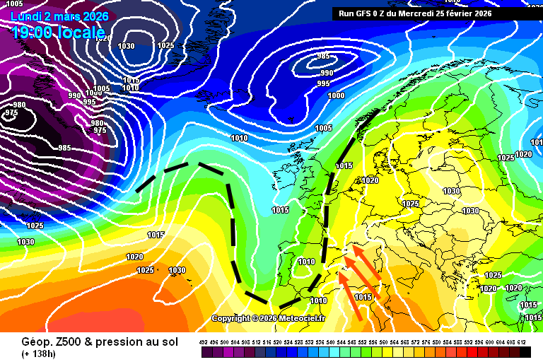 Nous sommes ce mercredi 25 février sous l'influence d'une dorsale anticyclonique qui s'étire de l'Afrique du nord jusqu'à l'Allemagne en passant par une large partie de la France et de l'Italie. Une petite zone dépressionnaire s'étire de l'Irlande au Portugal avec un très faible dynamisme. Elle implique un flux de secteur sud autour des régions Méditerranéennes favorisant le retour des entrées maritimes. Nous confirmons un regain anticyclonique demain jeudi ainsi que vendredi, mais avec toutefois la persistance du flux de sud (toujours propice à quelques entrées maritimes).