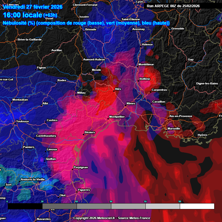Les températures maximales baissent sous les nuages mais demeurent très douces, autour de 14 à 16°C selon les secteurs. On atteint autour de 18/20°C sous le soleil. Vendredi, légère augmentation du dynamisme de sud : retour de nuages nombreux et tenaces surtout sur nos plaines. Les nuages finissent par envahir aussi nos reliefs entre l'après-midi et la soirée, avant une petite dégradation qui se confirme pour samedi. Ci-dessous, la carte de la nébulosité pour vendredi : le rouge indique la présence des nuages bas. Lorsque le fond de carte reste noir, cela veut dire que le sol est dégagé (se référer à la légende qui est facile à comprendre).