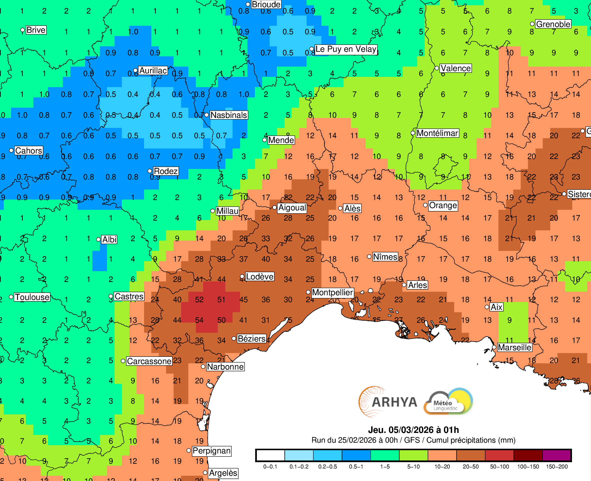 Plutôt en faveur d'un temps agréable lundi, mais basculant au marin... Retour des nuages mardi ? Option plausible. Une dégradation est envisagée autour du 3 ou 4 mars, avec des nuages et des passages pluvieux. Ces pluies ont une probabilité plus élevée de se produire sur le Roussillon et l'Ouest du Languedoc, ainsi que près du Massif-Central. On affinera le scénario d'ici là.