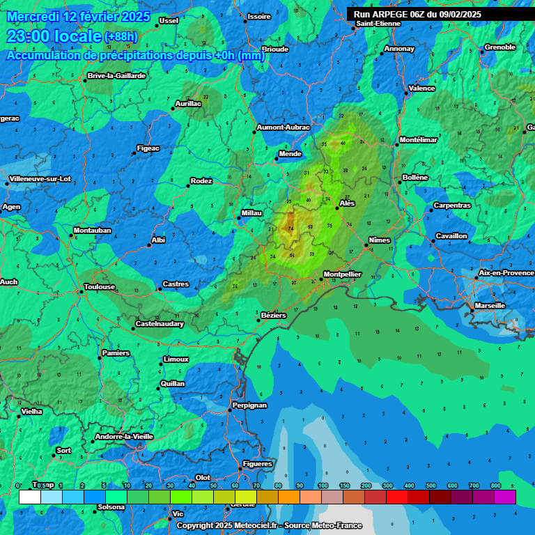 Mardi, le temps est calme entre l'Aude et les Pyrénées-Orientales avec du voile nuageux et des éclaircies. Entre l'Hérault et le Gard, les nuages sont plus épais. Des pluies se produisent sur les plaines de l'Est Hérault, du Gard ainsi qu'en Cévennes. Il peut tomber 5 à 10 mm dans l'intérieur des terres. Les averses sont moins prononcées et régulières sur l'Ouest Hérault. Mercredi, de petites pluies pourraient se produire sur une grande partie de nos plaines. Elles sont plus modérées entre l'Espinouse, le Caroux et l'Aigoual. Il neige à assez haute altitude. En 72h, les cumuls sont quand même significatifs près des Cévennes.
