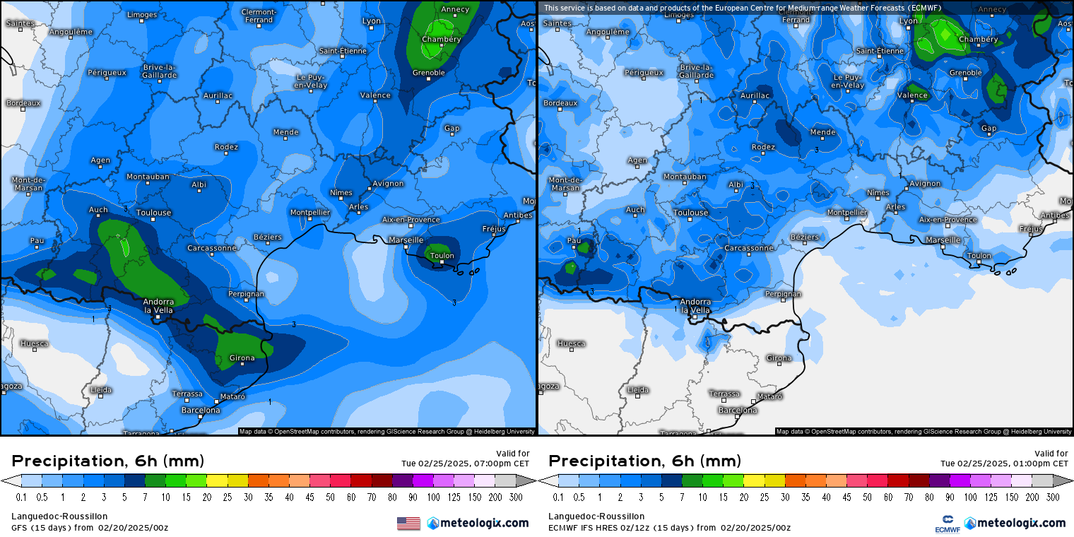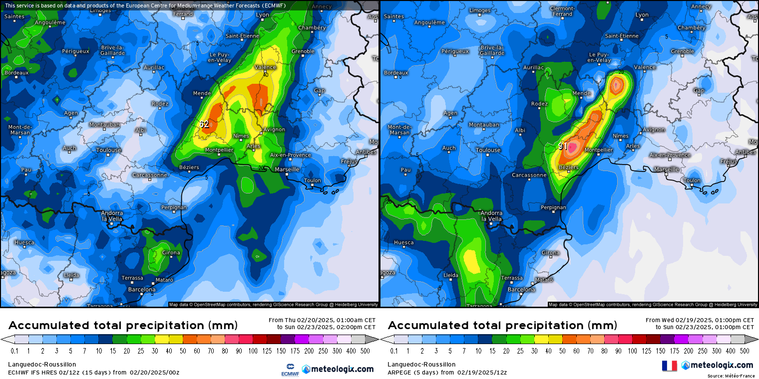 Le Roussillon peut espérer des passages pluvieux mais cela restera faible et bien insuffisant. Concernant les Cévennes, les cumuls attendus sont très ordinaires pour ces secteurs habitués aux épisodes cévenols. Cela n'empêchera pas d'avoir de nouvelles crues sur les cours d'eau déjà concernés par les précédents épisodes. Toutefois, ces crues resteront faibles et sans aucun risque de débordement dommageable.